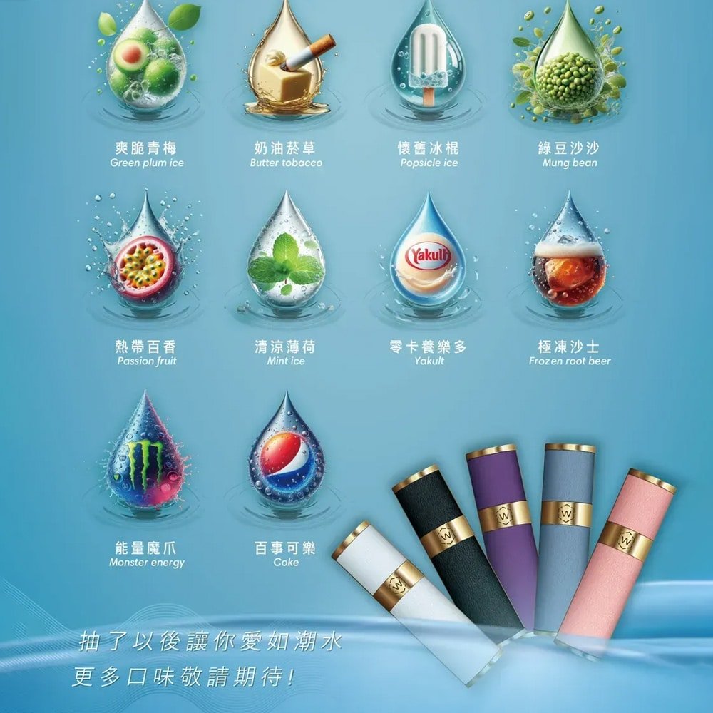 - 18種口味:原味煙草、微醺蜜桃、夏日西瓜、清涼薄荷、桑椹聖代等。